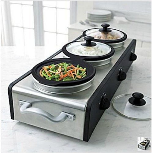 This triple buffet server has 3 compartments that holds 2.5 quarts. It is perfect for serving and cooking. It has non-skid feet, compact space saving design, and stainless steel finish. The individual temperature controls allows use of 1, 2, or all 3 at once. The settings are off, low, high, and warm.